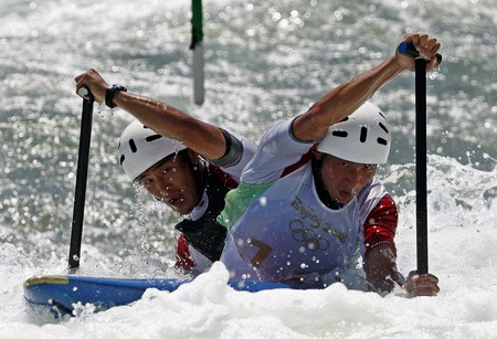 Japan's Masatoshi Samma (front) and Hiroyuki Nagao paddle during training for the men's canoe double race at the Beijing 2008 Olympic Games August 3, 2008. [Agencies]