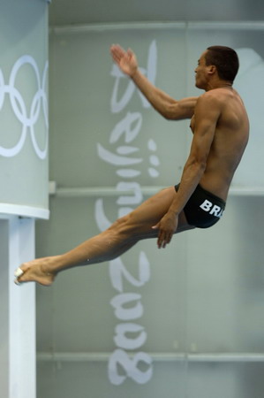 Brazil's Cesar Castro dives during a training session at the National Aquatics Centre ahead of the Beijing 2008 Olympic Games, August 3, 2008. [Agencies]