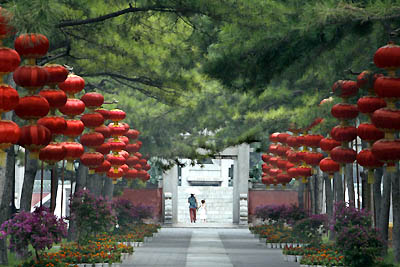 A mother and child walk past red lanterns at Ritan Park, one of three designated "protest parks" in Beijing July 25, 2008. [Agencies]