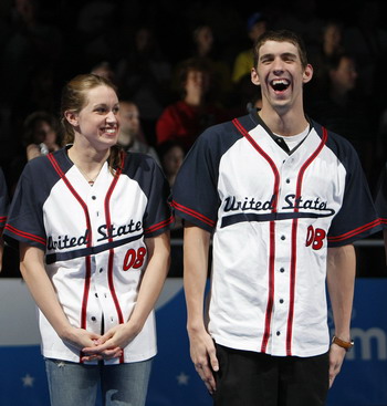 Michael Phelps (R) and Katie Hoff share a laugh as they wait for their introduction as part of the Olympic Team following the closing ceremonies at the US Olympic Swimming Trials in Omaha, Nebraska, July 6, 2008. [Agencies]