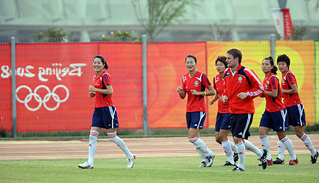 The Chinese women's football team in high spirits during training at Tianjin Olympic Center Stadium, August 4, 2008. Their first Olympic football match is on August 6, 2008, against Sweden. [Xinhua]