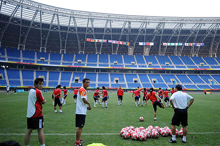 Dwarfed by the beautiful stadium the Chinese women's football team warms up before training at the Tianjin Olympic Center Stadium, August 4, 2008. Their first Olympic football match is on August 6, 2008, against Sweden. [Xinhua]