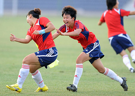 A light hearted warm up for the Chinese women's football team at the Tianjin Olympic Center Stadium, August 4, 2008. Their first Olympic football match is on August 6, 2008, against Sweden. [Xinhua]