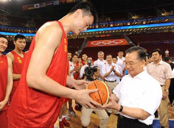 Yao Ming presents Premier Wen Jiabao a basketball autographed by all the players of National Men's Basketball team August 3, 2008.[sohu.com]