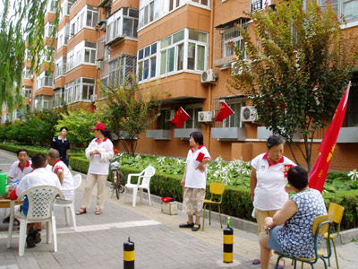 The security volunteers station along Huixin East Road, near the North Fourth Ring Road, August 1, 2008. [Tu Lei/chinadaily.com.cn]