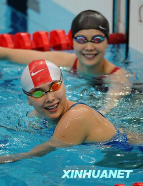 Chinese swimmer Yang Yu(F) of the national swimming team is training in the Water Cube,looking relax. China’s national swimming team are training for the Olympics in the National Aquatics Center or the Water Cube,August 4th, 2008.[Xinhua]