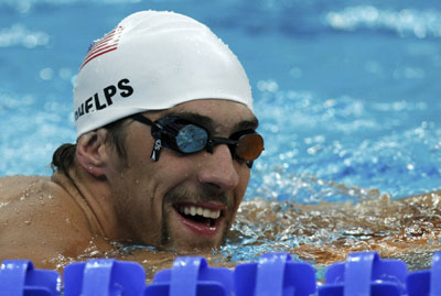 Michael Phelps of the US attends swimming practice at the National Aquatics Centre, also known as the Water Cube, ahead of the Beijing 2008 Olympic Games August 6, 2008. [Agencies]