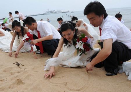 Newly-weds participate in a mass wedding ceremony on August 8 2008 in Qinhuangdao, North China's Hebei Province, one of the five cities hosting football matches for the Beijing Olympics. [Xinhua]
