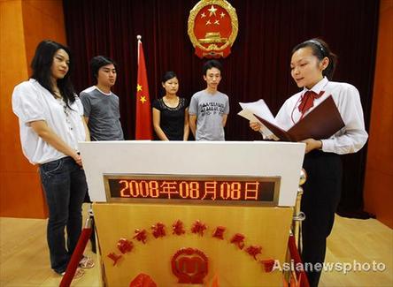 Two couples take the marriage oath at the Marriage Registry Office, Pudong District, Shanghai August 8, 2008. August 8, 2008, the opening day for the Beijing Olympics, is considered as an auspicious day for Chinese young people to get married. It is estimated there are 5,000 couples getting their certificates on this day in Shanghai, breaking the daily record in Shanghai's history. [Asianewsphoto]