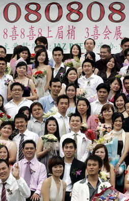 Some of the 238 ethnic Chinese Malaysians gather during their mass wedding ceremony, in conjunction with the date 08.08.08, in Klang outside Kuala Lumpur August 8, 2008. The number 8 signifies prosperity in Chinese custom. [Agencies]