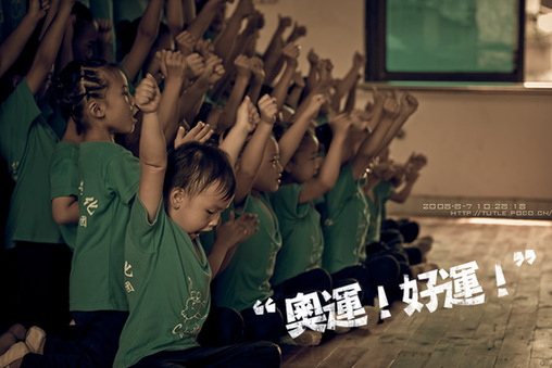 Kids in dancing class make a gesture of "Jiayou, China" in a group photo.