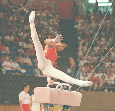 Li Ning performs his routine on the pommel horse at the Los Angeles Olympic Games in this 1984 file photo. [Xinhua]