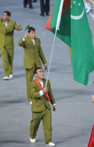 Athlete Guvanch Nurmuhammedov (C), Turkmenistan's flag bearer parade in front of his delegation during the 2008 Beijing Olympic Games opening ceremony on August 8, 2008 at the National Stadium in Beijing. Over 10,000 athletes from some 200 countries and regions are going to compete in 38 different disciplines during the event, between August 9 and 24. [Agcenies]