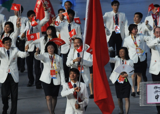 | Athlete Kam-Po Wong (C), flag bearer from China's Hong Kong Special Administrative Region, parades in front of his delegation during the 2008 Beijing Olympic Games opening ceremony on August 8, 2008 at the National Stadium in Beijing. [Agencies] |