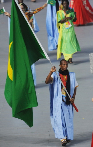 Athlete Souleymane Chebal Moctar (C) Mauritania's flag bearer parades in front of his delegation during the 2008 Beijing Olympic Games opening ceremony on August 8, 2008 at the National Stadium in Beijing. [Agencies]