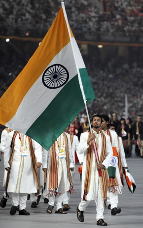 Rajvardhan Singh Rathore leads the Olympic delegation of India as they parade during the opening ceremony of the 2008 Beijing Olympic Games at the National Stadium, also known as the "Bird's Nest", on August 8 2008. [Agencies]