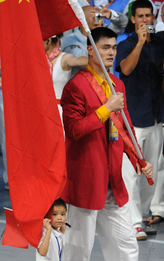 General view shows Chinese flag bearer Yao Ming (R) leads the Chinese delegation next to nine-year-old Lin Hao during the opening ceremony of the 2008 Beijing Olympic Games in Beijing on August 8, 2008. The three-hour show at Beijing's iconic "Bird's Nest" National Stadium is set to see more than 15,000 performers showcase the nation's ancient history and its development. [Agencies]