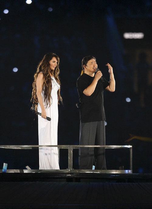 Chinese singer Liu Huan and British singer Sarah Brightman sing the theme song of the Beijing 2008 Olympic Games during the opening ceremony of the Games at the National Stadium August 8, 2008. [Xinhua]