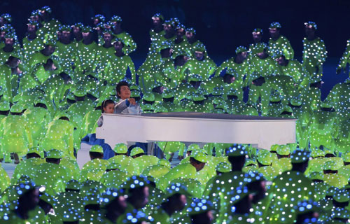 Pianist Lang Lang performs during the opening ceremony of the Beijing 2008 Olympic Games at the National Stadium, August 8, 2008. The stadium is also known as the Bird's Nest. [Agencies]