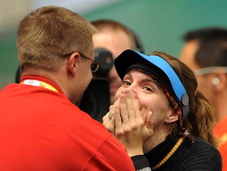Czech markswoman Katerina Emmons celebrates winning women's 10-meter air rifle with her husband at the Beijing Shooting Range Hall August 9 2008. The 25-year-old blonde improved Olympic Record of the discipline to 503.5 points, winning the firs gold medal of the Beijing Games.[Xinhua]