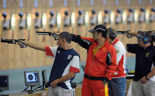Pang Wei (C) competes in the men's 10m air pistol qualification at the 2008 Beijing Olympic Games on August 9, 2008 in Beijing Shooting Range Hall. Pang won the second gold medal for the Chinese delegation in the men's 10m air pistol competition on August 9, 2008. [Agencies]