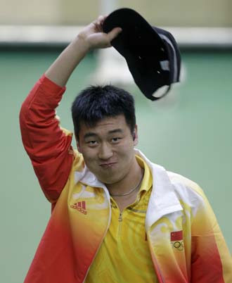 Pang Wei of China celebrates winning the gold in the men's air pistol shooting competition at the Beijing 2008 Olympic Games August 9, 2008. Jin Jong-oh of South Korea won the silver and Kim Jong-su of North Korea took the bronze. [Agencies]