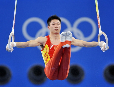 China's Li Xiaopeng competes on the rings during the men's qualification of the artistic gymnastics event of the Beijing 2008 Olympic Games in Beijing on August 9, 2008. [Agencies]