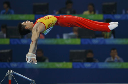Li Xiaopeng of China competes in the men's qualification horizontal bar during the artistic gymnastics competition at the Beijing 2008 Olympic Games August 9, 2008. [Agencies]