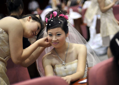 Chinese brides prepare for a mass wedding ceremony in Wuhan, central China's Hubei province on 08 August 2008. China claimed it set a world record for marriages on a single day to coincide with the opening of the 2008 Beijing Olympic Games, with some 14,591 couples registered in Beijing alone. [Agencies]