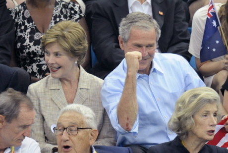 US President George W. Bush (R) and his wife Laura Bush watch the first day of the swimming finals at the National Aquatics Center during the 2008 Beijing Olympic Games on August 10, 2008 in Beijing. [Agencies]