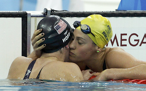 Australia's Stephanie Rice (R) and Katie Hoff of the United States hug each other after the women's 400m individual medley swimming final at the National Aquatics Center druing the 2008 Beijing Olympic Games on August 10, 2008 in Beijing. Rice claimed the gold medal in world record time, shaving 1.67 seconds off the previous record held by Katie Hoff. [Agencies]