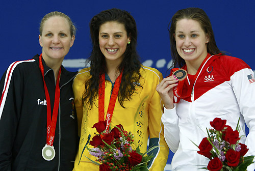 Gold medallist Stephanie Rice (C) of Australia stands with silver medallist Kirsty Coventry (L) of Zimbabwe and bronze medallist Katie Hoff (R) of the US after the women's 400 meters individual medley swimming final during the Beijing 2008 Olympic Games August 10, 2008. [Agencies]