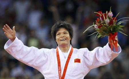 Gold medal winner Xian Dongmei of China waves on podium during the judo women's -52 kg category medal ceremony at the Beijing 2008 Olympic Games, August 10, 2008. [Agencies]