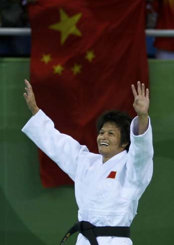 Xian Dongmei of China celebrates after defeating An Kum Ae of North Korea during their women's -52 kg final judo match at the Beijing 2008 Olympic Games, August 10, 2008. [Agencies]