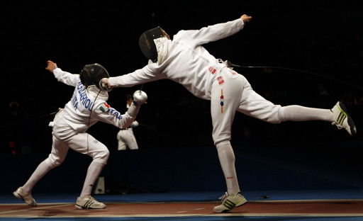 Italy's Matteo Tagliariol (L) competes against the Netherland's Bas Verwijlen during their men's individual Epee quarter final match on August 10, 2008 at the Fencing Hall of National Convention Center in Beijing, as part of the 2008 Beijing Olympic games. [Agencies] |
