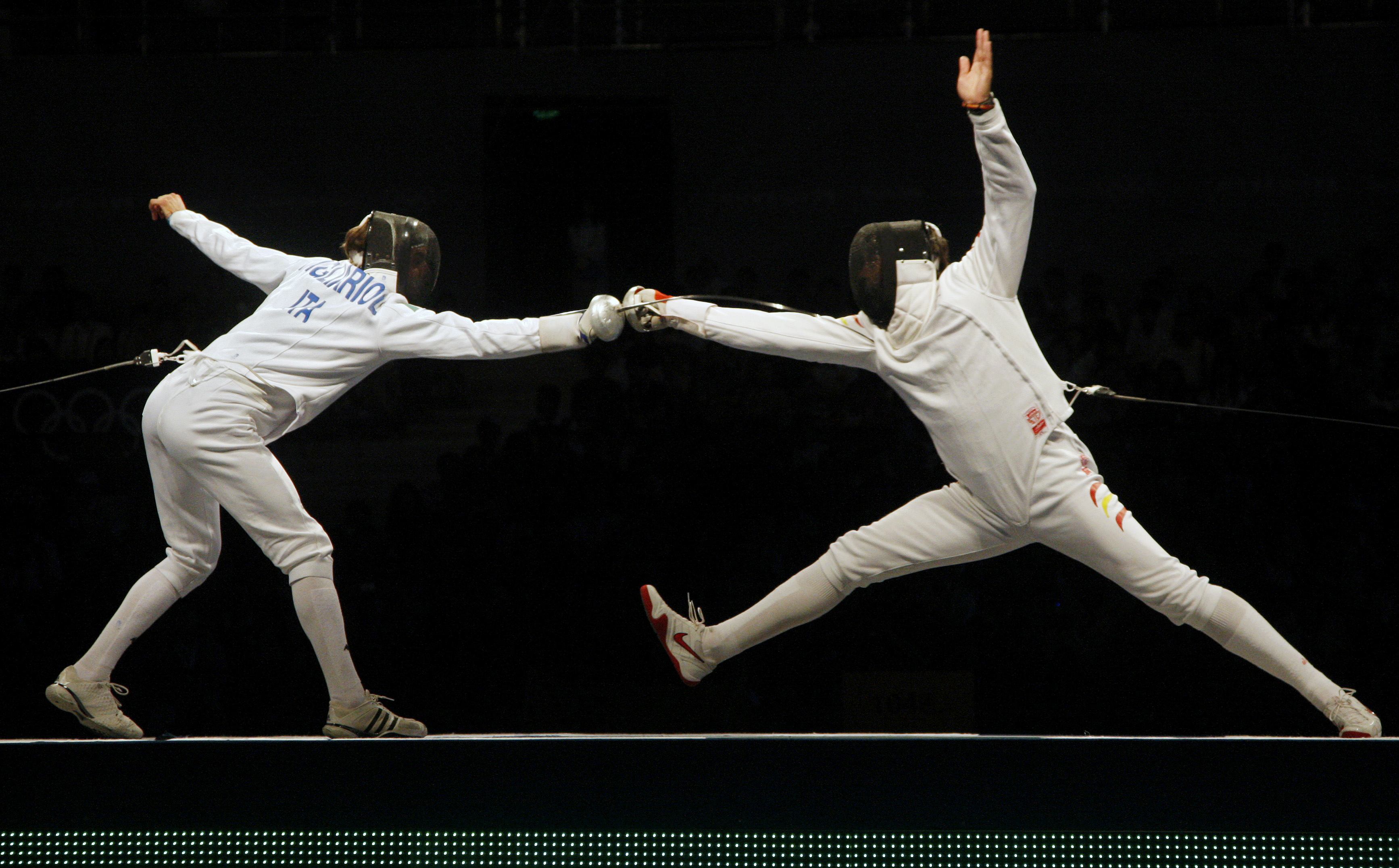 Matteo Tagliariol of Italy (L) competes against Jose Luis Abajo of Spain during their men's individual epee semi-finals at the Beijing 2008 Olympic Games, August 10, 2008.[Agencies] |