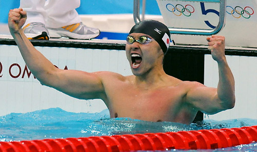 Japan's Kosuke Kitajima celebrates victory as he claims the title of the men's 100m breaststroke swimming at the National Aquatics Center in the 2008 Beijing Olympic Games on August 11, 2008. Kitajima, defending the title he won in Athens four years ago, broke the previous record of 59.13 set by US swimmer Brendan Hansen at Irvine, California, on August 1, 2006. [Agencies]