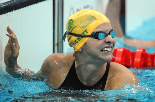 Australia's Lisbeth Trickett celebrates after winning the women's 100m butterfly swimming final at the National Aquatics Center in the 2008 Beijing Olympic Games on August 11, 2008. [Agencies]