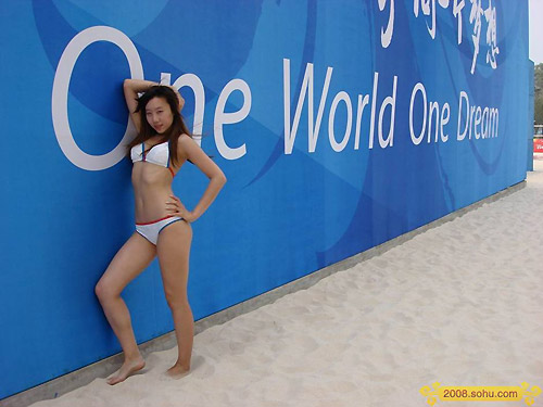 A Chinese cheerleader poses during the Men's preliminary Beach Volleyball at Beijing's Chaoyang Park Beach Volleyball Ground on the first day of competitions of the 2008 Beijing Olympic Games on August 9, 2008.[www.sohu.com]