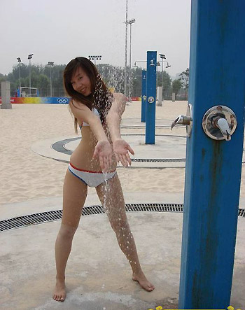 A Chinese cheerleader poses during the Men's preliminary Beach Volleyball at Beijing's Chaoyang Park Beach Volleyball Ground on the first day of competitions of the 2008 Beijing Olympic Games on August 9, 2008.[www.sohu.com]