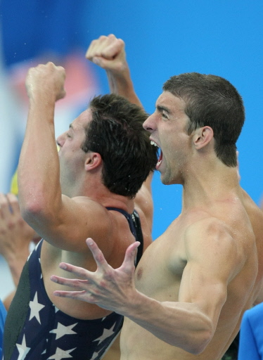 US swimmer Michael Phelps (R) and compatriot Garrett Weber-Gale celebrate after taking gold in the men's 4X100m freestyle relay swimming final at the National Aquatics Center in the 2008 Beijing Olympic Games on August 11, 2008.[Agencies]