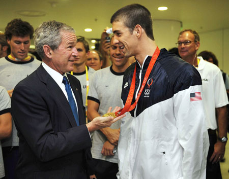 US President George W. Bush (L) looks at the medal of US swimming gold medallist Michael Phelps (R) after Bush attended the 2008 Beijing Olympic Games swimming events at the National Aquatics Center on August 10, 2008 in Beijing.
