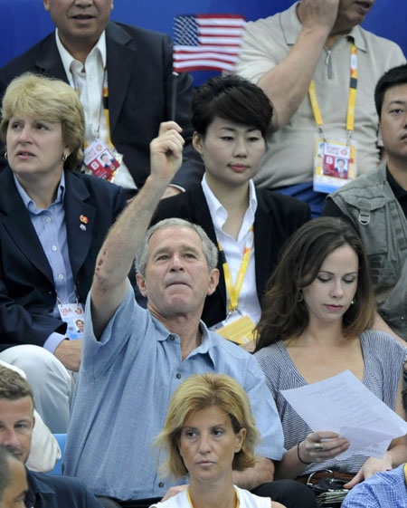 US President George W. Bush (L) waves his national flag as his daughter Barbara looks on at the National Aquatics Center during the Beijing 2008 Olympic Games, August 11, 2008.