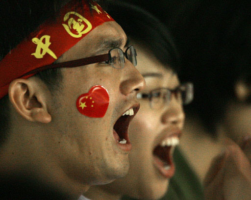 Chinese fans follow the game Bulgaria vs. China during their preliminary volleyball Pool A match at the Capital Gymnasium on August 10, 2008 during the 2008 Beijing Olympic Games. Bulgaria won the match 3-1.[Agencies]