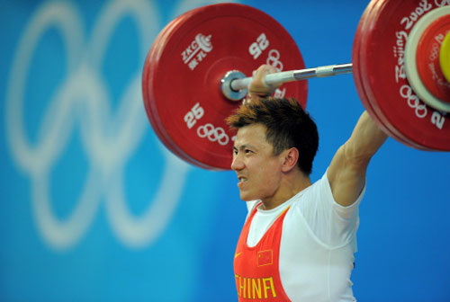 Zhang Xiangxiang of China competes in the men's 62 kg weightlifting event during the 2008 Beijing Olympic Games at the Beijing University of Aeronautics and Astronautics Gymnasium in Beijing on August 11, 2008.[Agencies]
