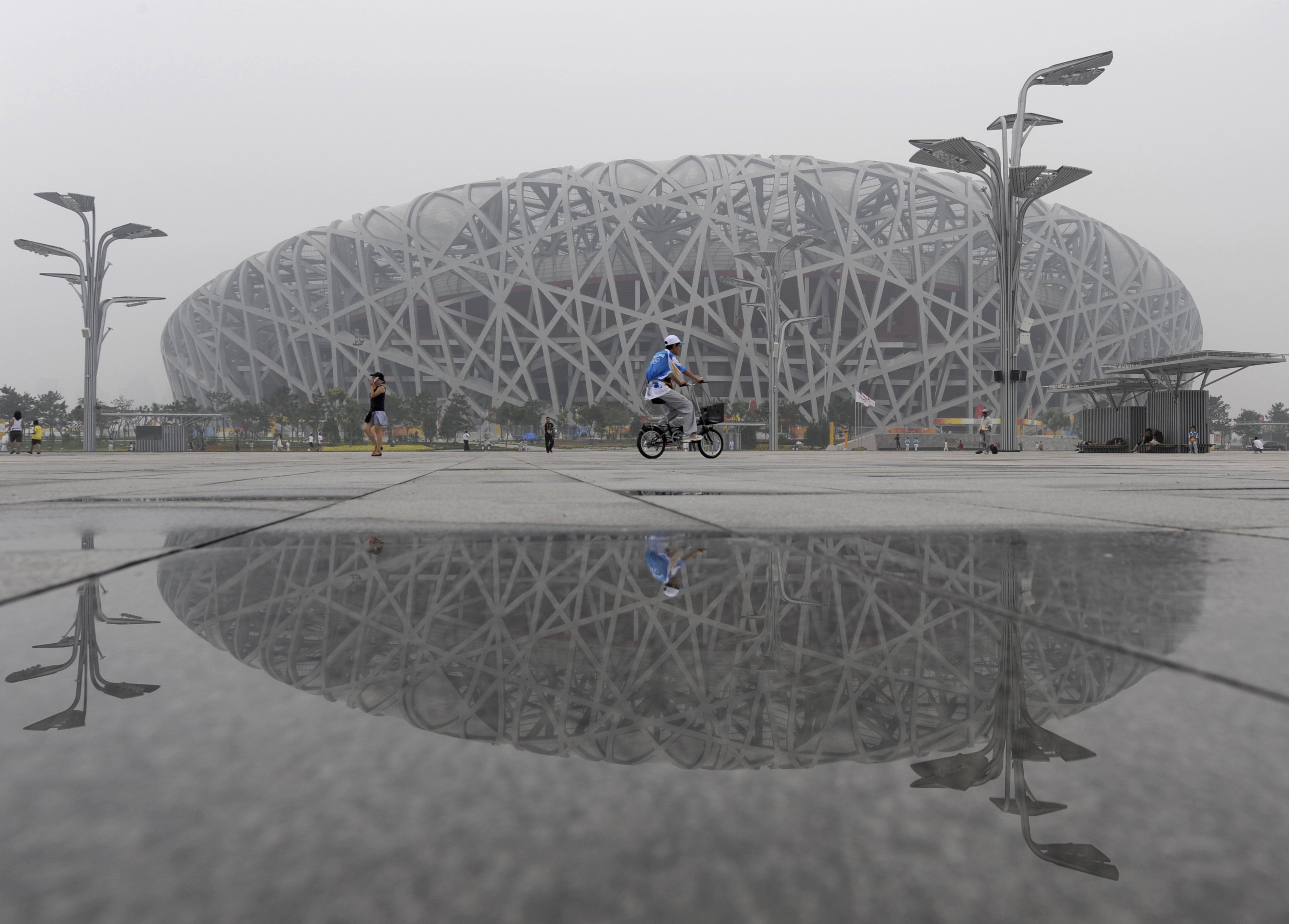 The National Stadium, also known as the Bird's Nest, is seen reflected after rainfall in Beijing, August 10, 2008. [Agencies] |