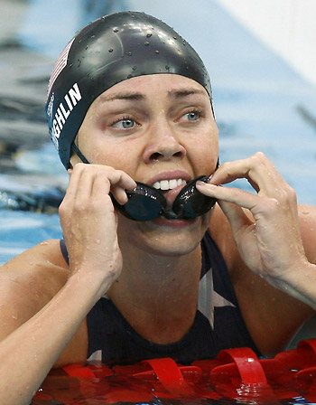 Natalie Coughlin of the US removes her goggles after her women's 100m backstroke swimming semifinal at the National Aquatics Centre during the Beijing 2008 Olympic Games, August 11, 2008. Coughlin clocked in 58.96 seconds to take the women's 100m backstroke gold medal at the Beijing Olympic Games here on Tuesday. [Agencies]