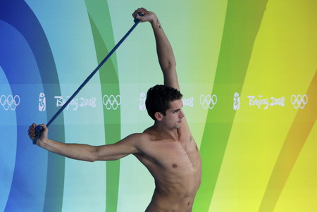 Eamon Sullivan of Australia stretches during practice at the National Aquatics Centre, also known as the Water Cube, ahead of the swimming competition at the Beijing 2008 Olympic Games August 5, 2008. [Agencies]