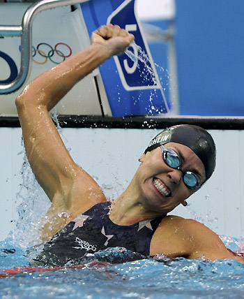 Natalie Coughlin of the U.S. celebrates winning the women's 100m backstroke swimming final at the National Aquatics Center during the 2008 Beijing Olympics August 12, 2008. [Agencies]