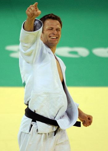 Germany's Ole Bischof celebrates after winning his fight against Brazil's Tiago Camilo during their men's -81kg judo match of the 2008 Beijing Olympic Games on August 12, 2008 in Beijing. [Agencies]